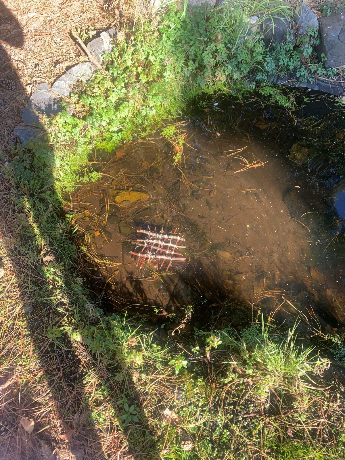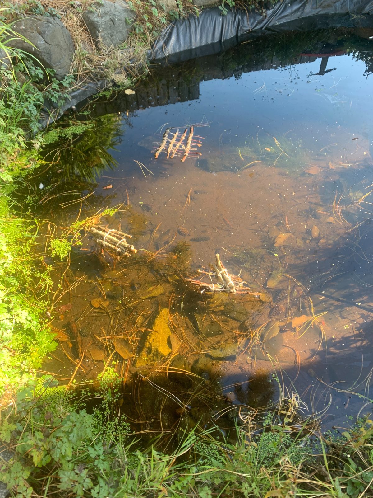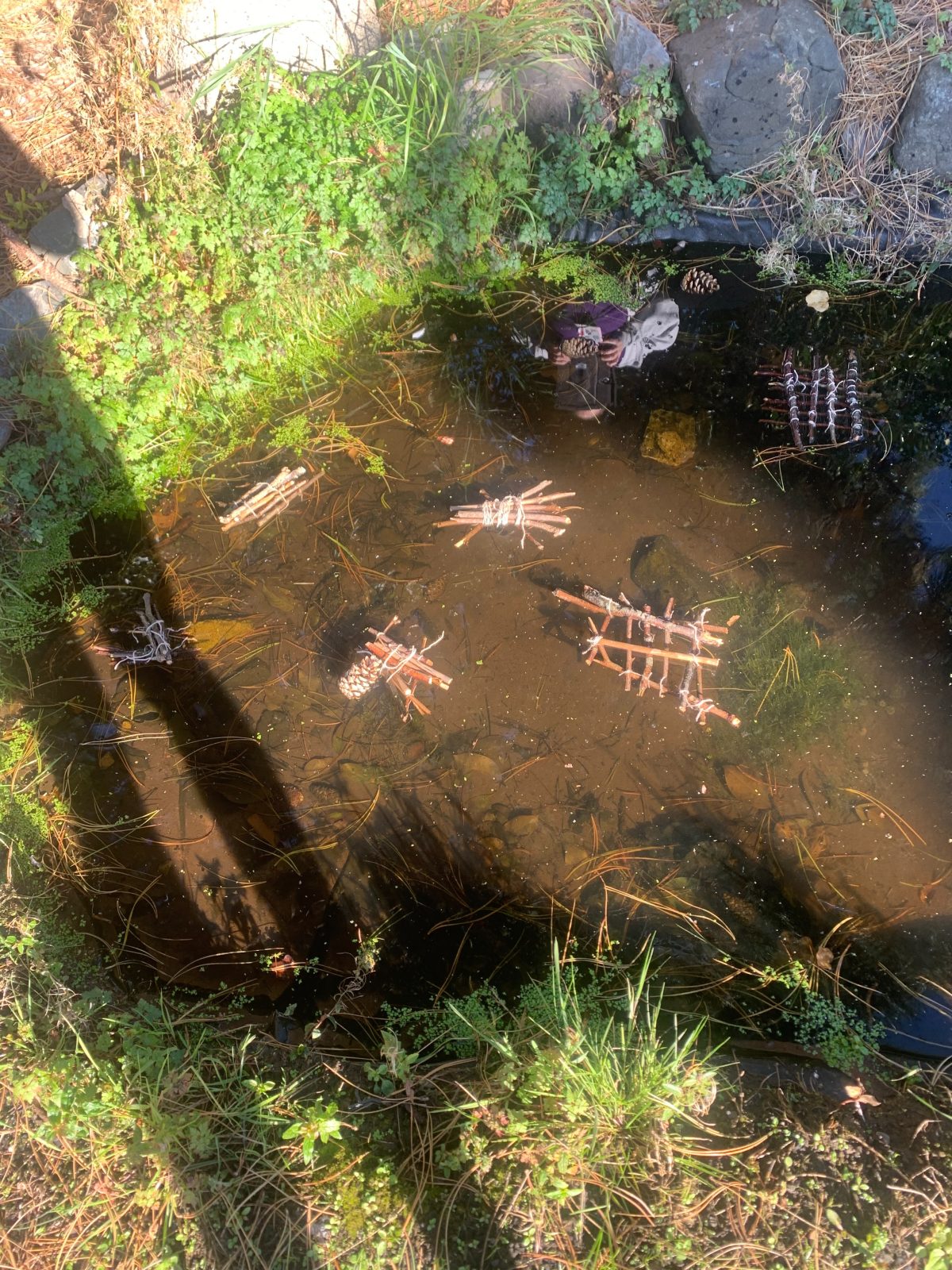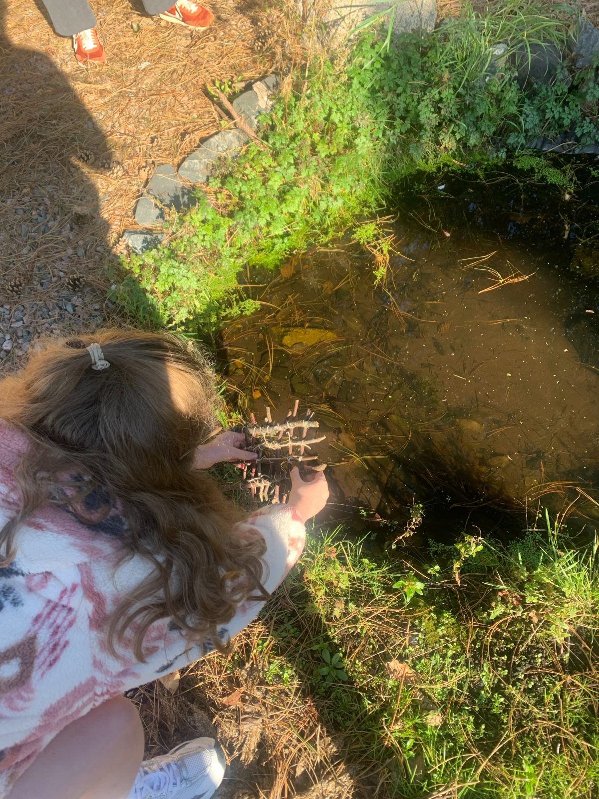 Spoke about what a Raft is and how we would go about building one. Discussed the tools that we would use. Moved out to the Polytunnel to cut our sticks and tie them together. Went down to the pond in our sensory garden to see if our rafts float!