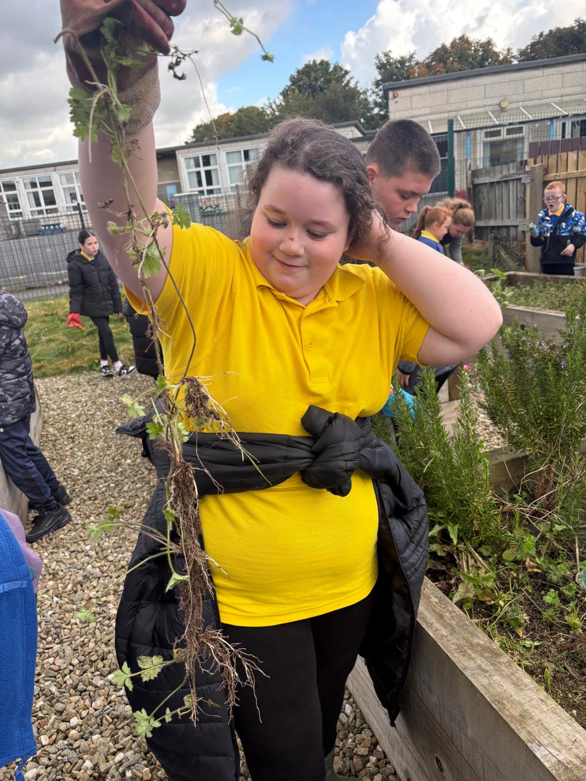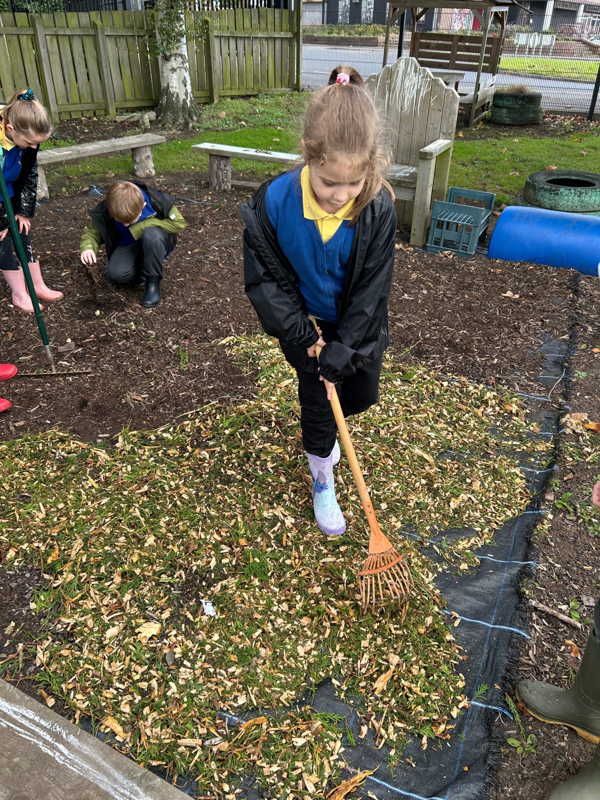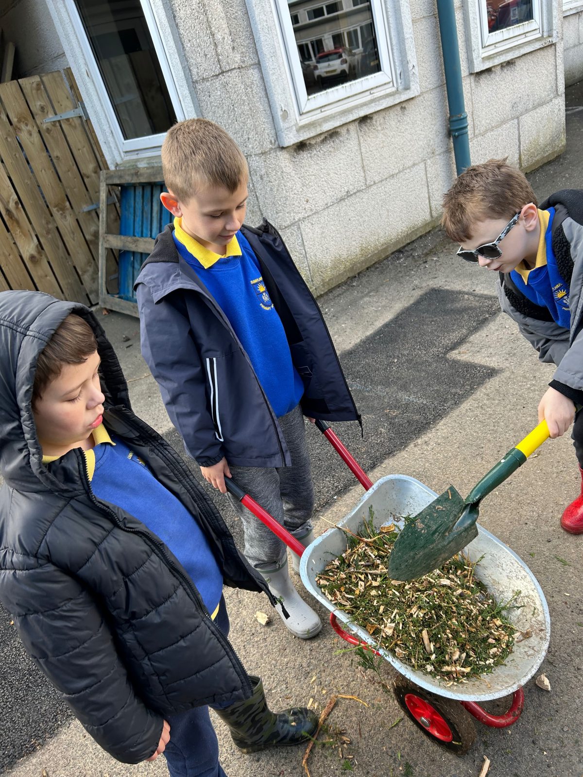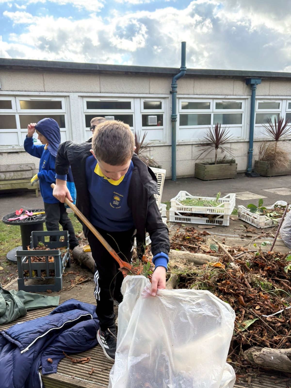We had our Big Muck In to tidy up the school grounds. The children worked incredibly hard, laying down bark, weeding, tidying the allotment area and even harvesting the last of the potatoes.