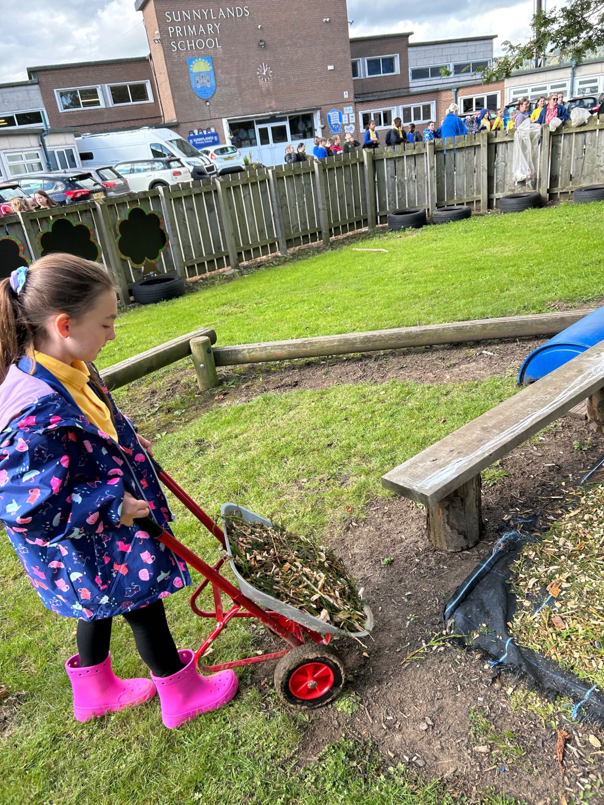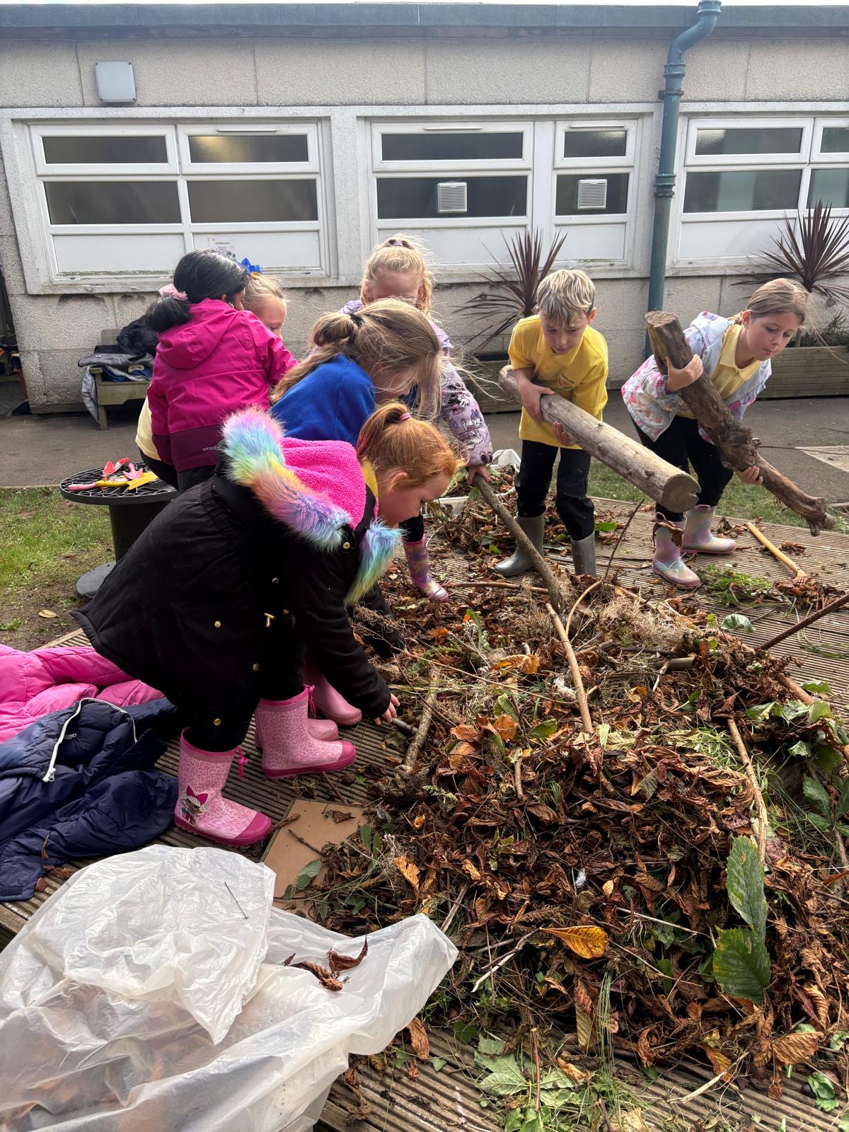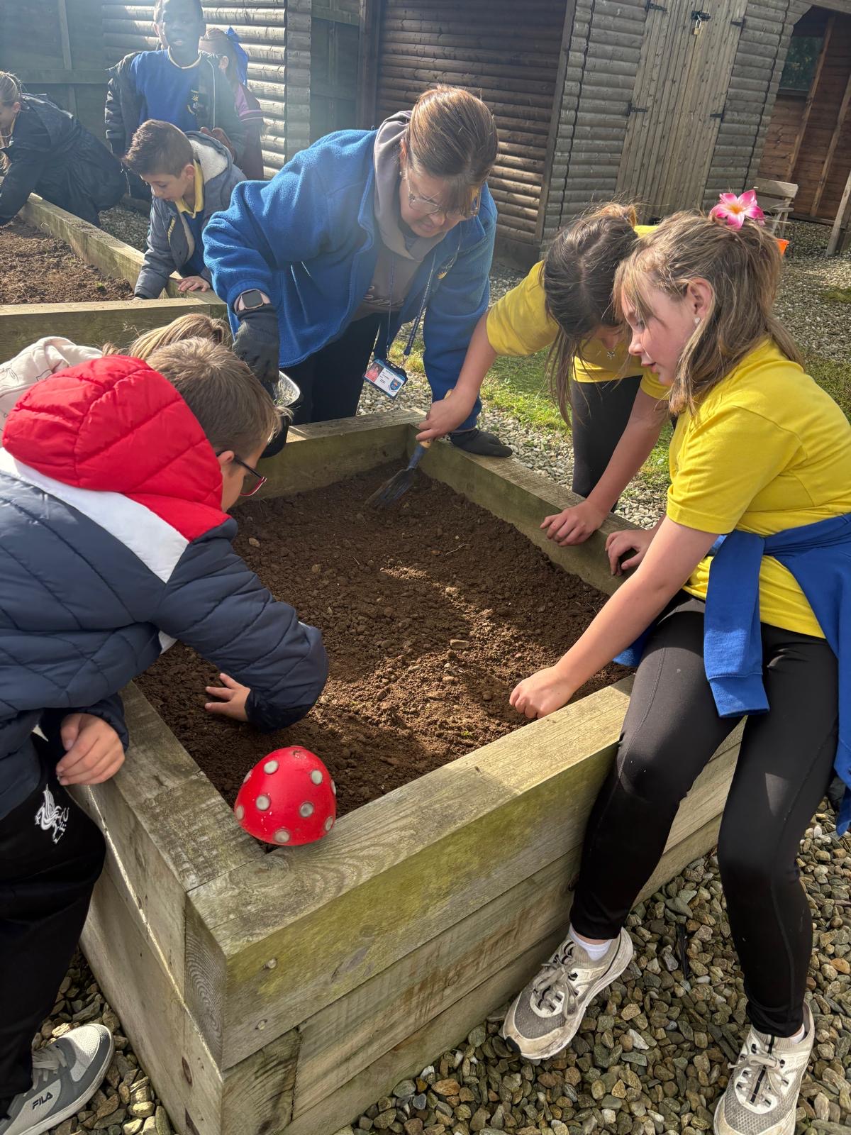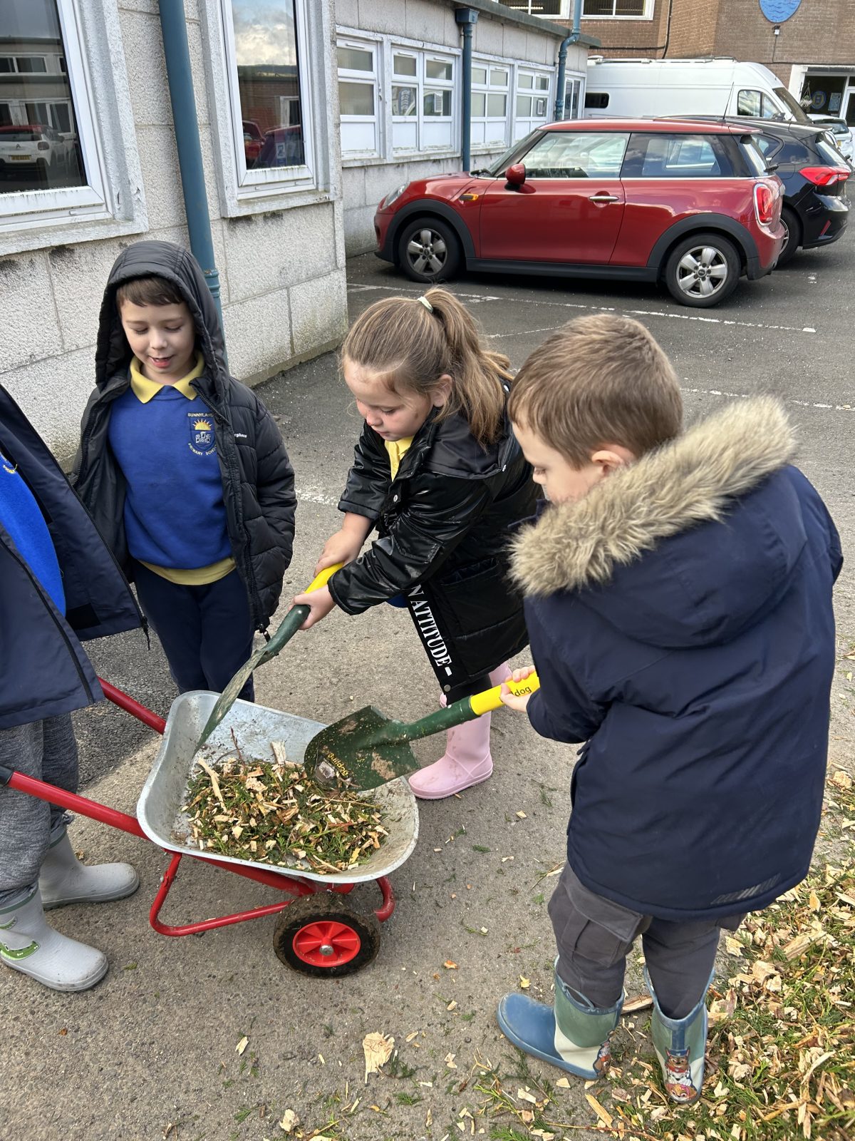 We had our Big Muck In to tidy up the school grounds. The children worked incredibly hard, laying down bark, weeding, tidying the allotment area and even harvesting the last of the potatoes.