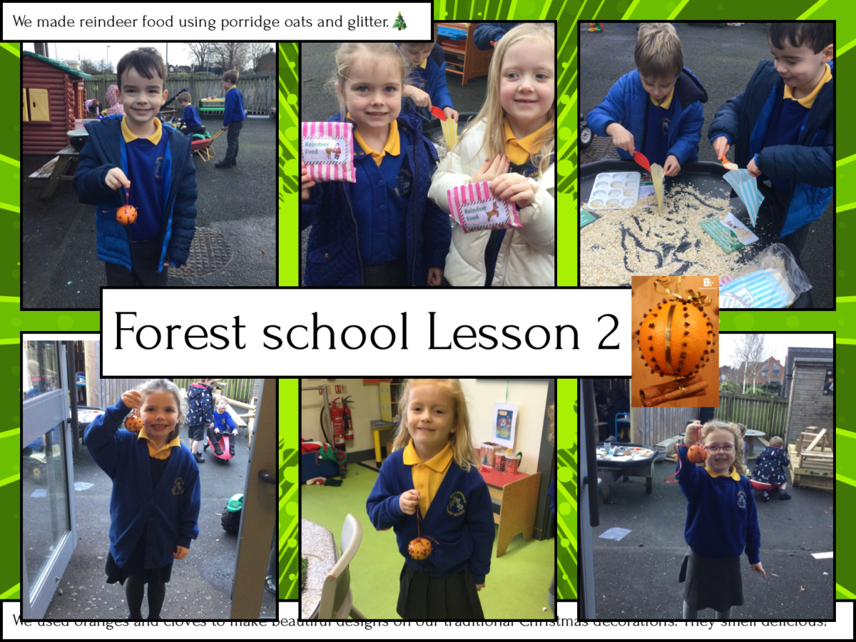 The children had a magical time making their own reindeer food using porridge oats and a sprinkle of glitter. They carefully scooped the ingredients into paper bags and decorated them with festive stickers, ready to leave out for Santa’s reindeer on Christmas Eve. They also created beautiful Christingles using oranges, cloves, and ribbons. We explored the lovely scents of the cloves and talked about how they smelled, then the children designed their own patterns by pressing the cloves into the oranges. These Christingles were used to decorate our Forest School site before the children took them home to add some festive cheer to their houses.