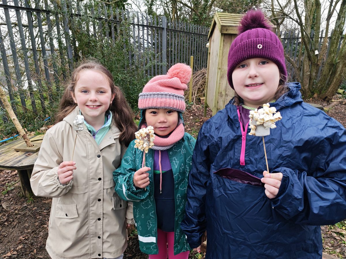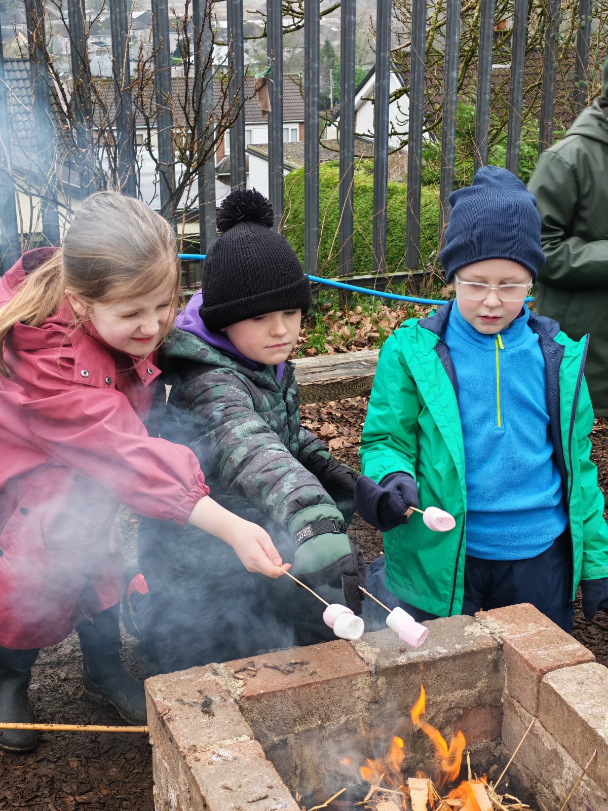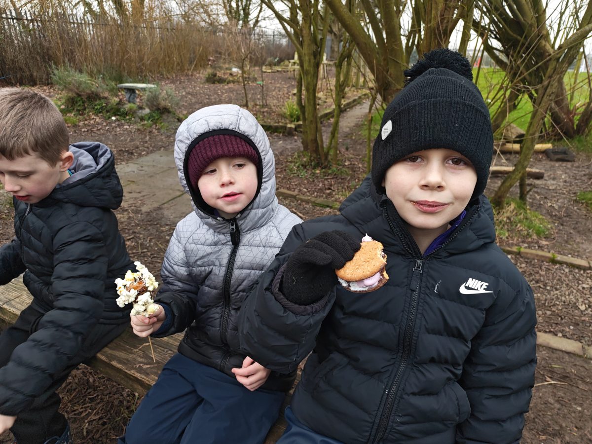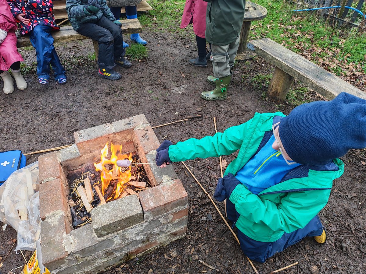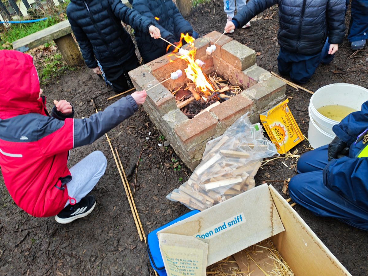 The main activity was planting a pea to watch grow and helped introduce our new topic Food Glorious Food. We entered the green house- sat carefully and they children listened as I gave the instructions and showed what we were going to do. The children each had a pot with their name on it which they filled half way with soil, they made 3 small holes with their fingers and placed one pea into each hole and finally covered with some soil. The new seeds were placed on a tray ready to take to the classroom. To finish we made our way to base where we all sat around the firepit. I had the fire pit base ready- but we discussed fire safety- added the boundaries using bamboo sticks and talked about what a fire might need. This allowed lots of opportunity for talk and discussion. once the fore was lit- the children noted the way the wind was blowing and were able to move out of the way. They made a que with Louise (CA) to get a skewer with marshmallows on it which they in groups of 3 toasted carefully over the firepit. Then they could make smores or pop-mallows if they wished. We ended with a little song- extinguished the fire to ensure we left no trace. The children had a ball for their first lesson and cant wait to do their next.