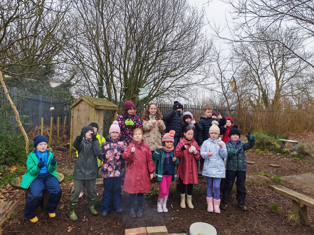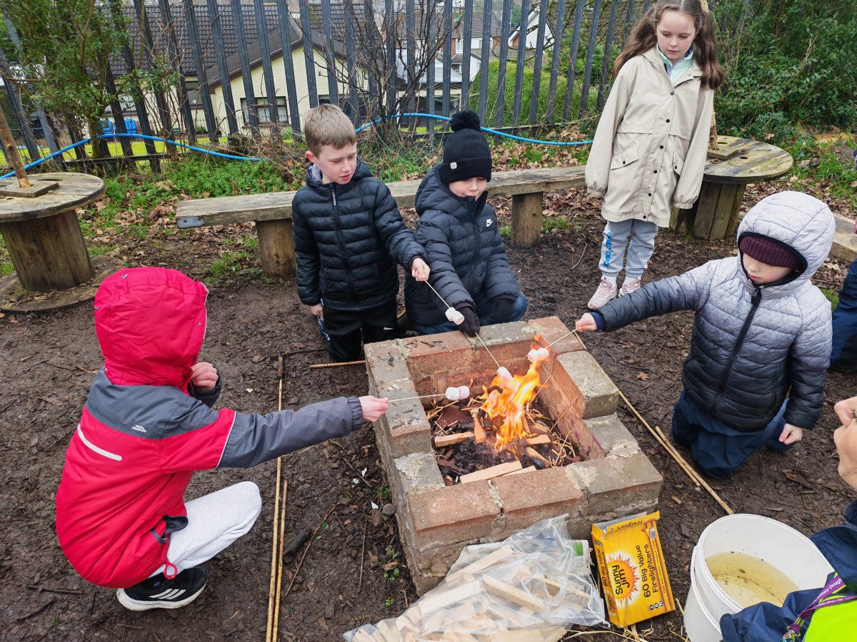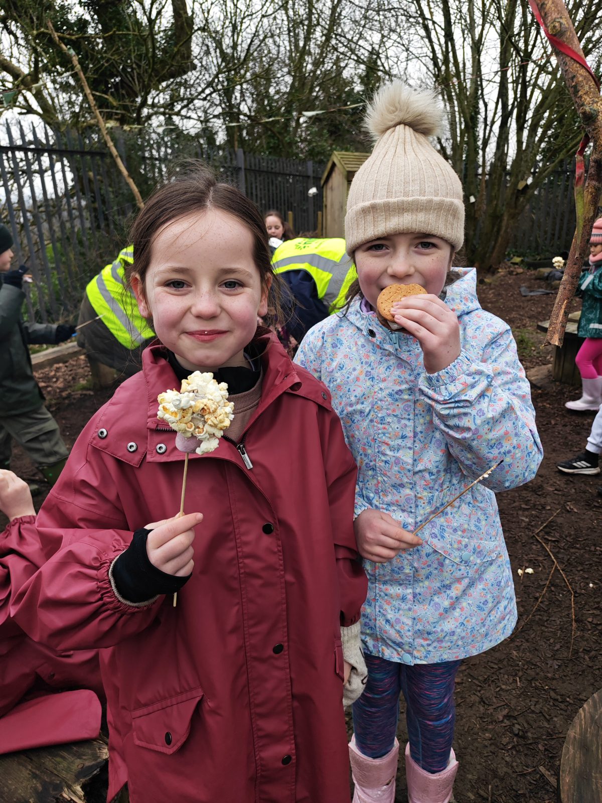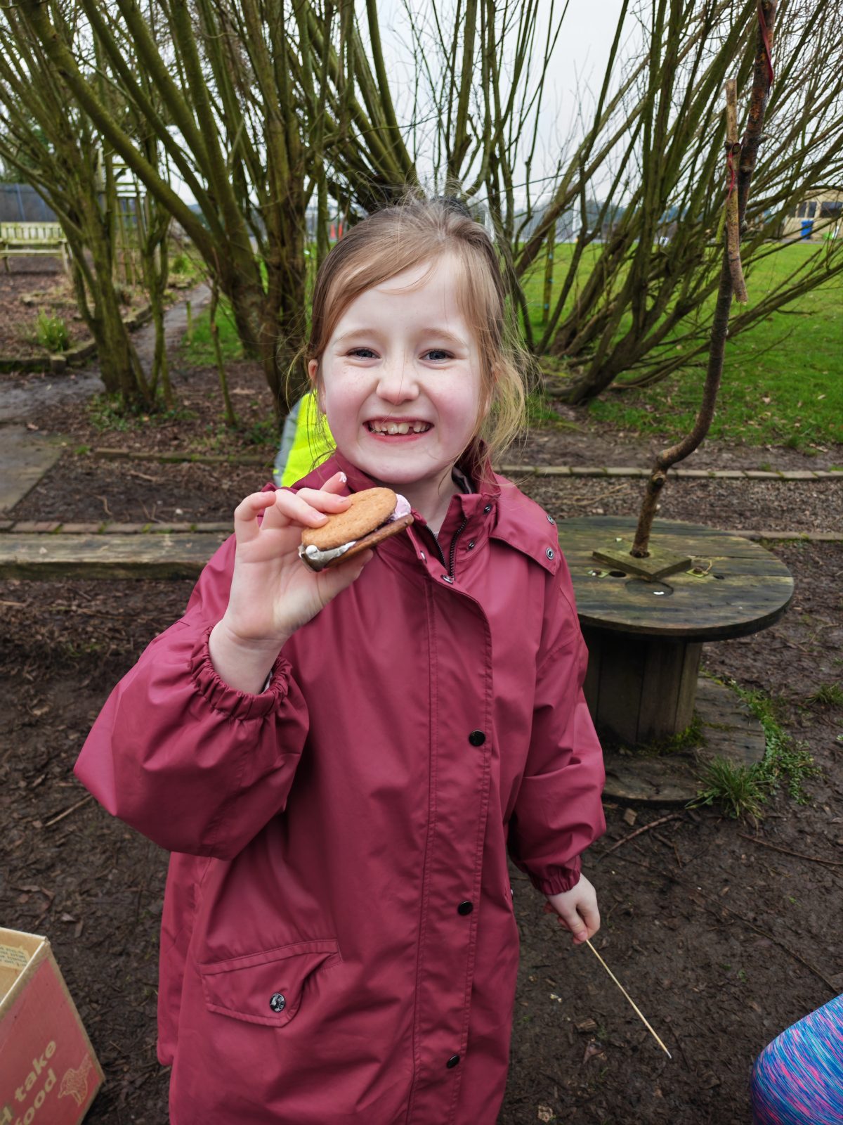 The main activity was planting a pea to watch grow and helped introduce our new topic Food Glorious Food. We entered the green house- sat carefully and they children listened as I gave the instructions and showed what we were going to do. The children each had a pot with their name on it which they filled half way with soil, they made 3 small holes with their fingers and placed one pea into each hole and finally covered with some soil. The new seeds were placed on a tray ready to take to the classroom. To finish we made our way to base where we all sat around the firepit. I had the fire pit base ready- but we discussed fire safety- added the boundaries using bamboo sticks and talked about what a fire might need. This allowed lots of opportunity for talk and discussion. once the fore was lit- the children noted the way the wind was blowing and were able to move out of the way. They made a que with Louise (CA) to get a skewer with marshmallows on it which they in groups of 3 toasted carefully over the firepit. Then they could make smores or pop-mallows if they wished. We ended with a little song- extinguished the fire to ensure we left no trace. The children had a ball for their first lesson and cant wait to do their next.