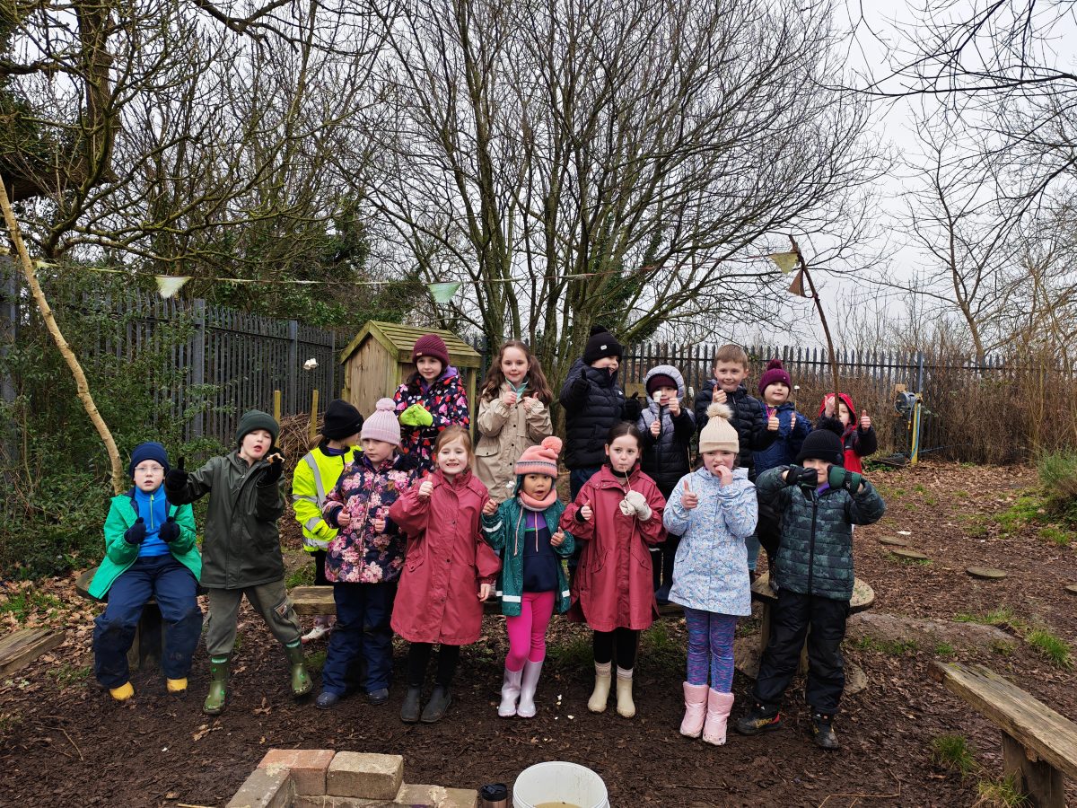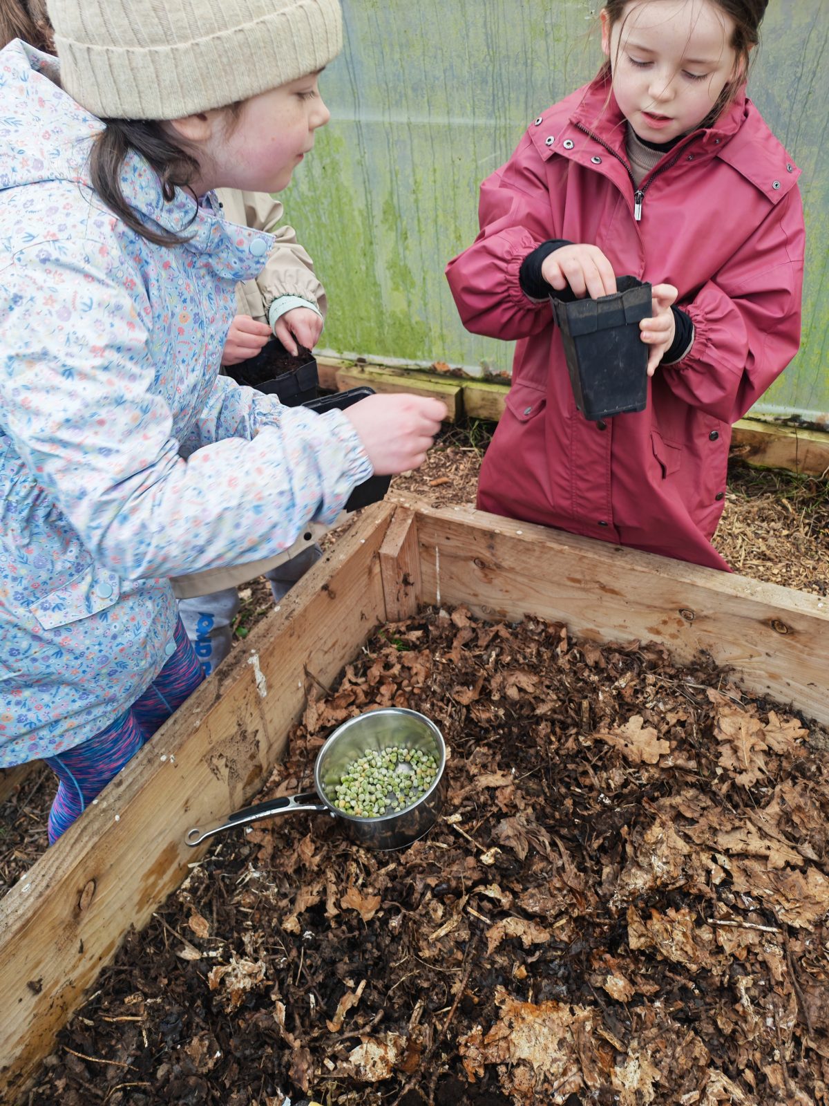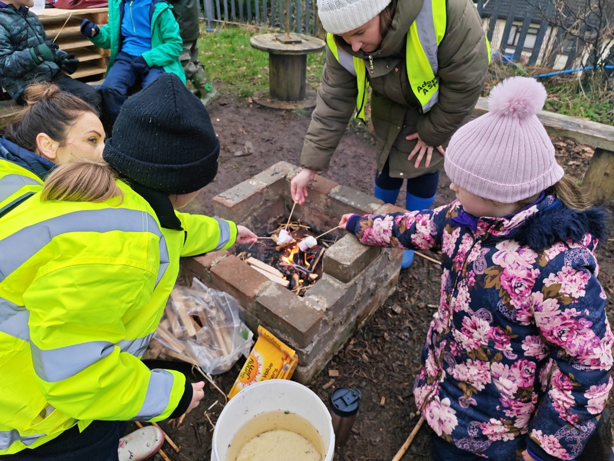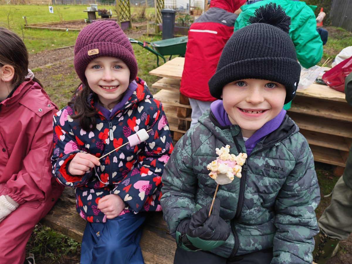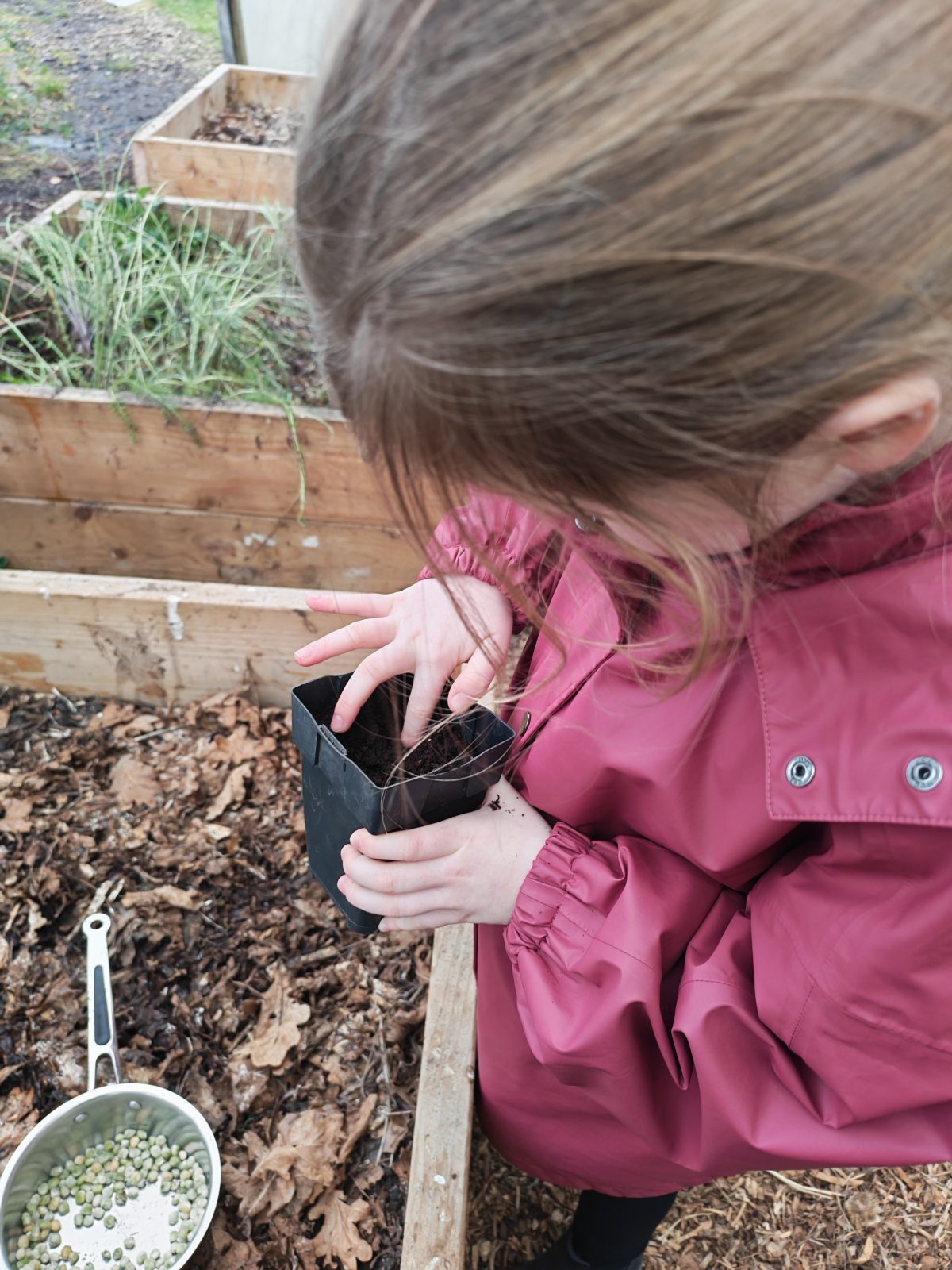The main activity was planting a pea to watch grow and helped introduce our new topic Food Glorious Food. We entered the green house- sat carefully and they children listened as I gave the instructions and showed what we were going to do. The children each had a pot with their name on it which they filled half way with soil, they made 3 small holes with their fingers and placed one pea into each hole and finally covered with some soil. The new seeds were placed on a tray ready to take to the classroom. To finish we made our way to base where we all sat around the firepit. I had the fire pit base ready- but we discussed fire safety- added the boundaries using bamboo sticks and talked about what a fire might need. This allowed lots of opportunity for talk and discussion. once the fore was lit- the children noted the way the wind was blowing and were able to move out of the way. They made a que with Louise (CA) to get a skewer with marshmallows on it which they in groups of 3 toasted carefully over the firepit. Then they could make smores or pop-mallows if they wished. We ended with a little song- extinguished the fire to ensure we left no trace. The children had a ball for their first lesson and cant wait to do their next.