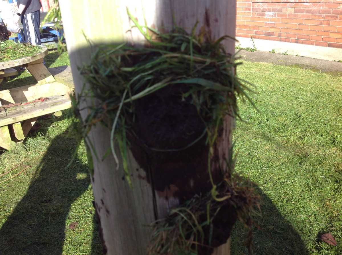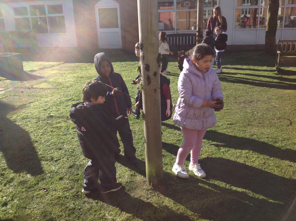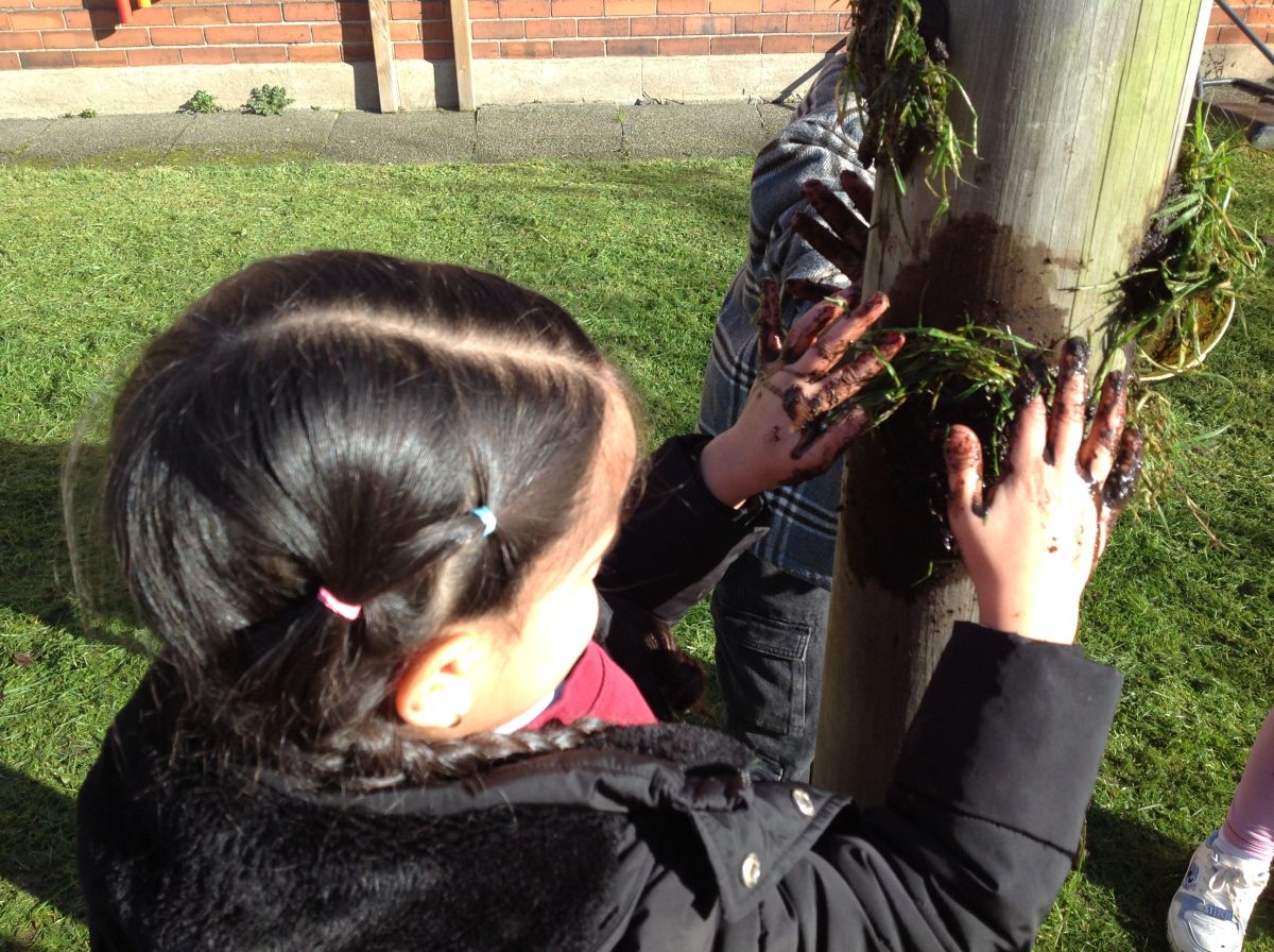 The children created mud by mixing soil and water. They added a muddy face to a tree and decorated it with natural materials to make a funny face.