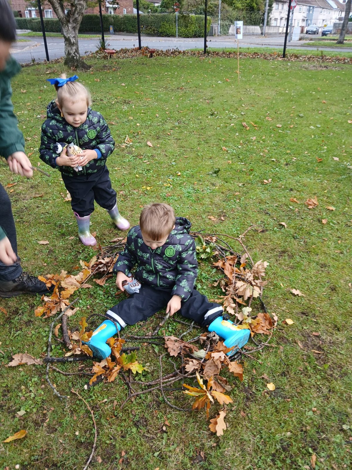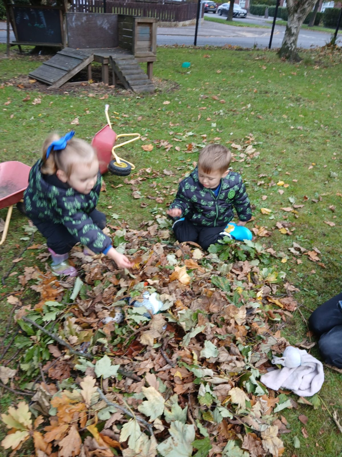 Physical;- provided opportunity for full body movement, running to get the resources, developing cross lateral movement and proprioceptive, children came up with the idea of using wheelbarrows pushing to an area with a lot of leaves lifting them in and bringing it back.