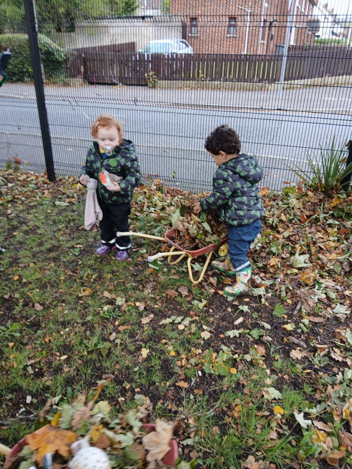 Language and communication;-children discussed what materials they need and one child directed the others to put the leaves in the wheelbarrow.