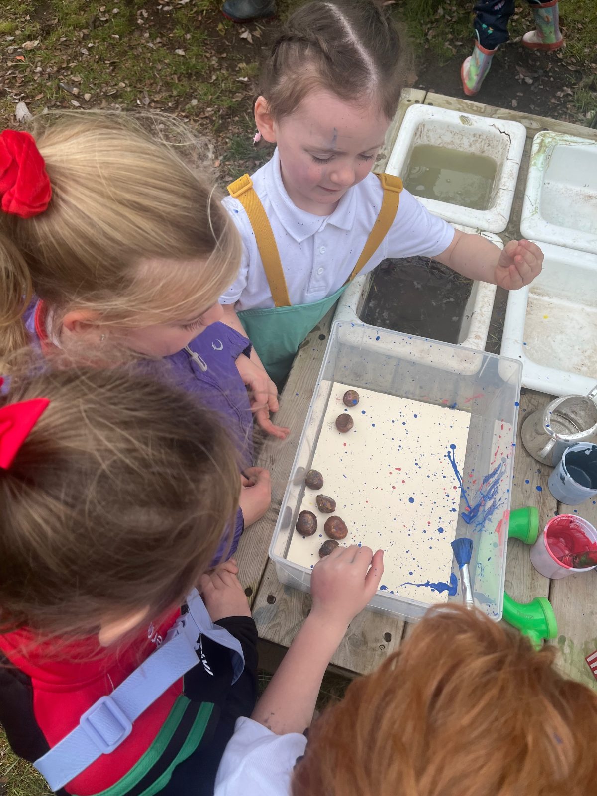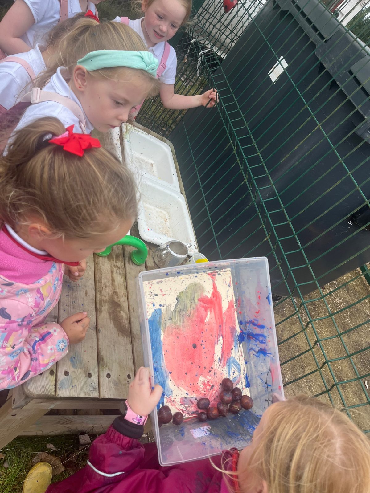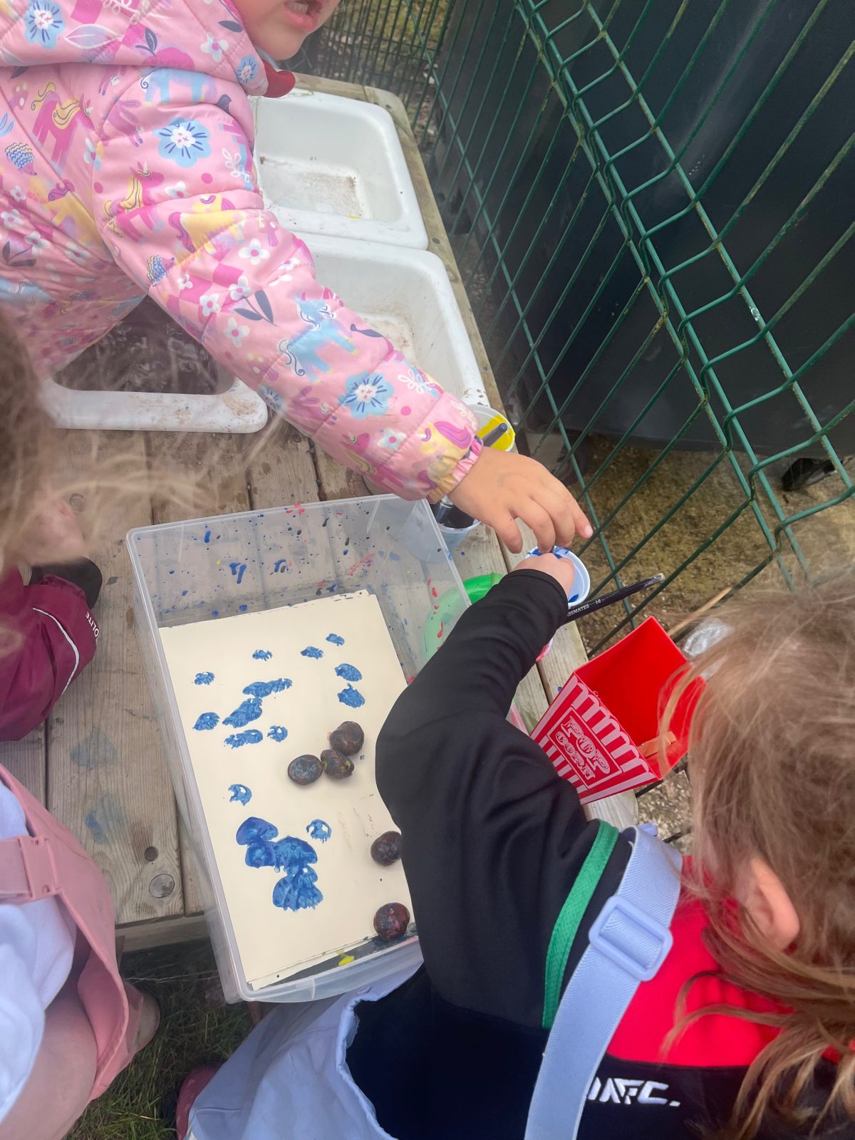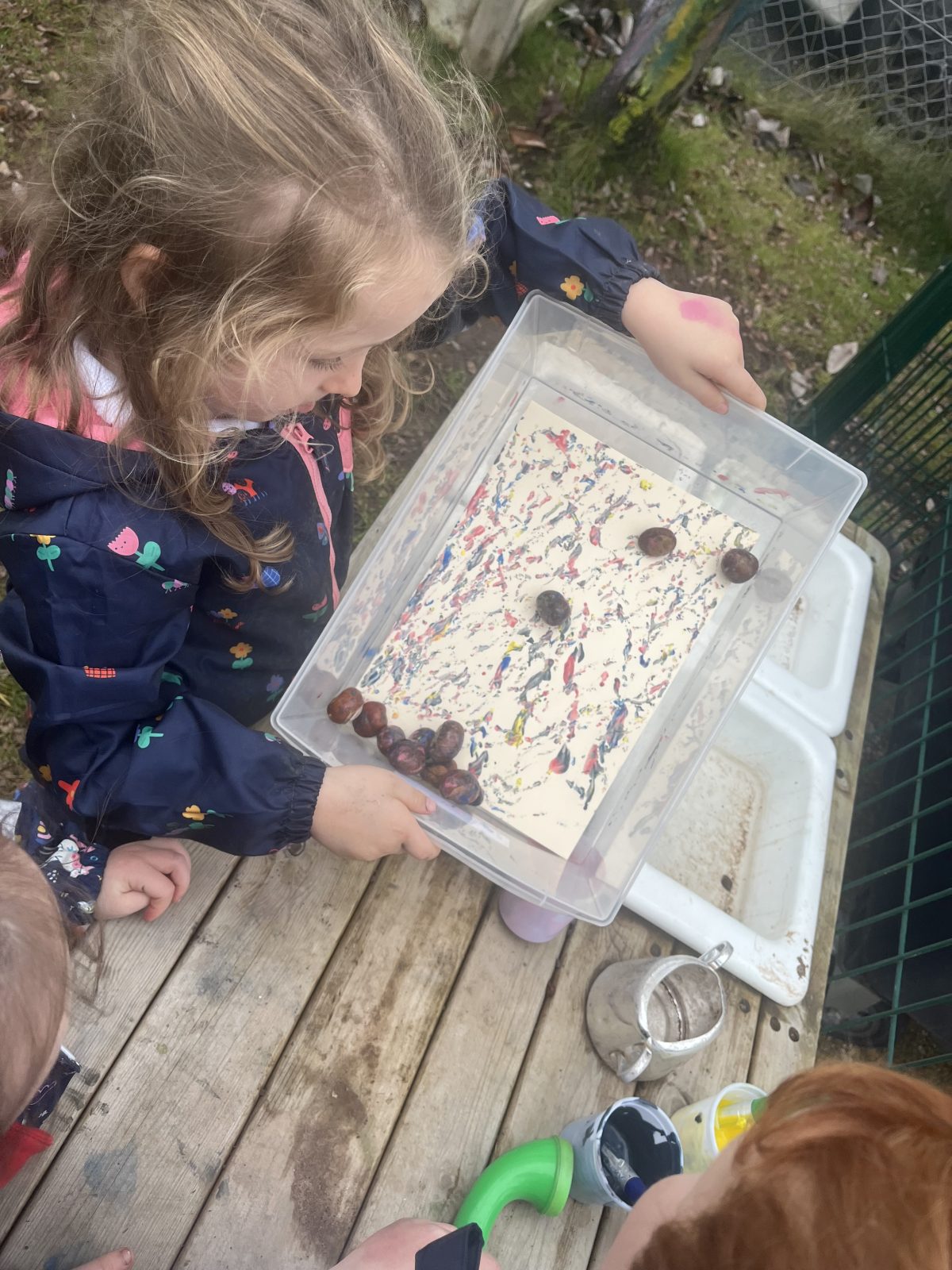 Conker roll! The children went on a Nature walk and gathered some conkers! They discussed where they came from, their shape, size and colour then had some fun creating colourful conker roll art! By simply adding some paint, they let the good times roll! 😂