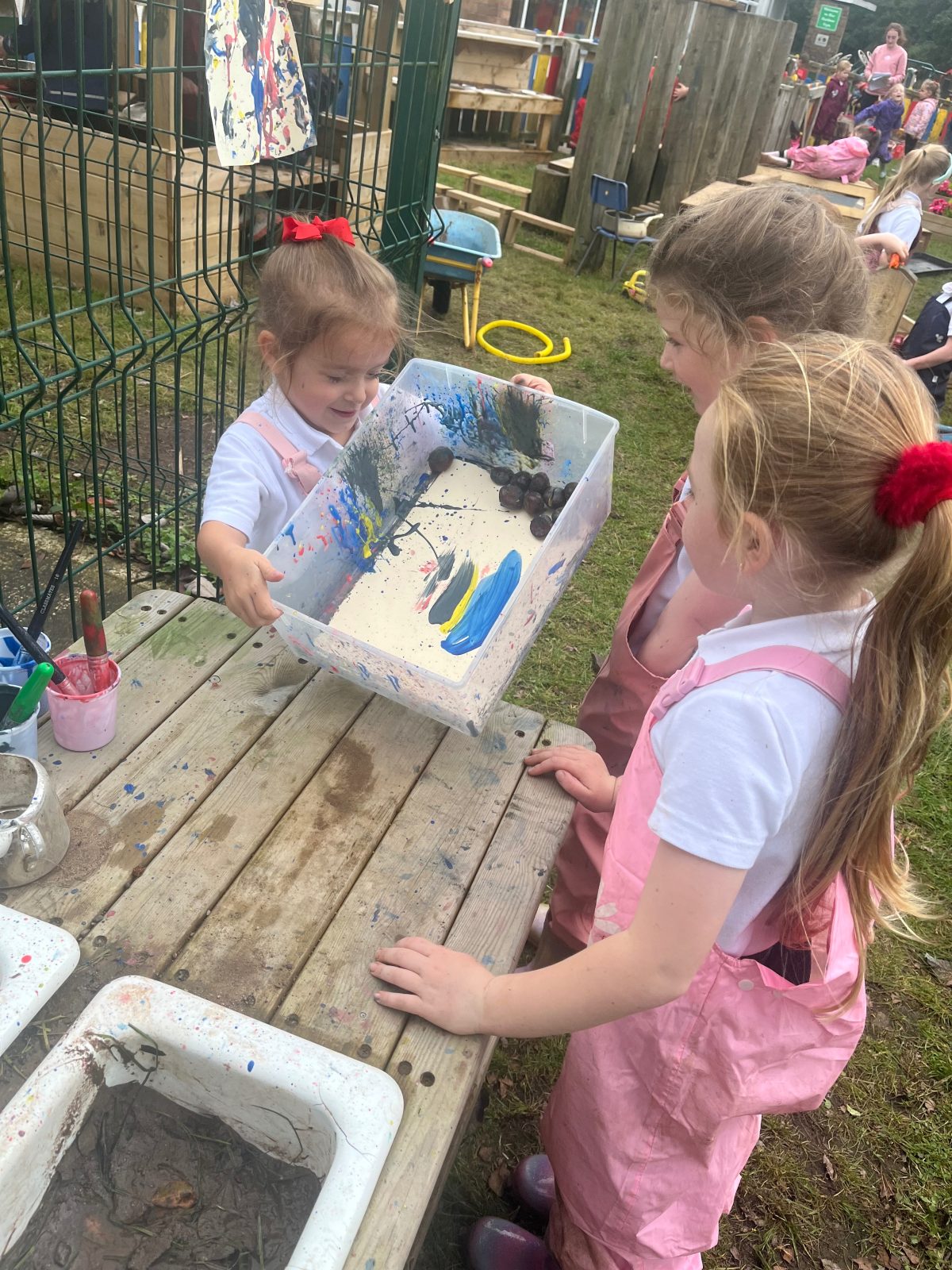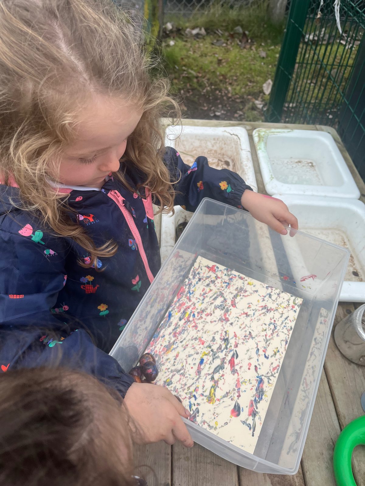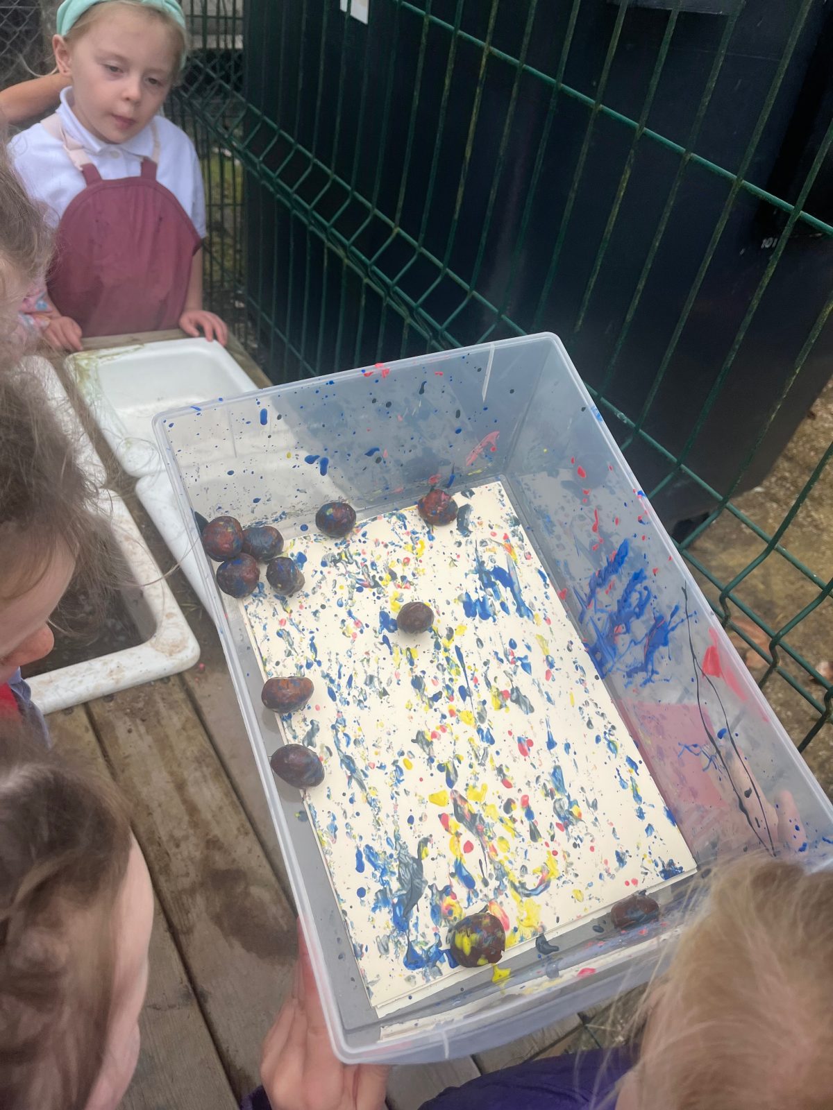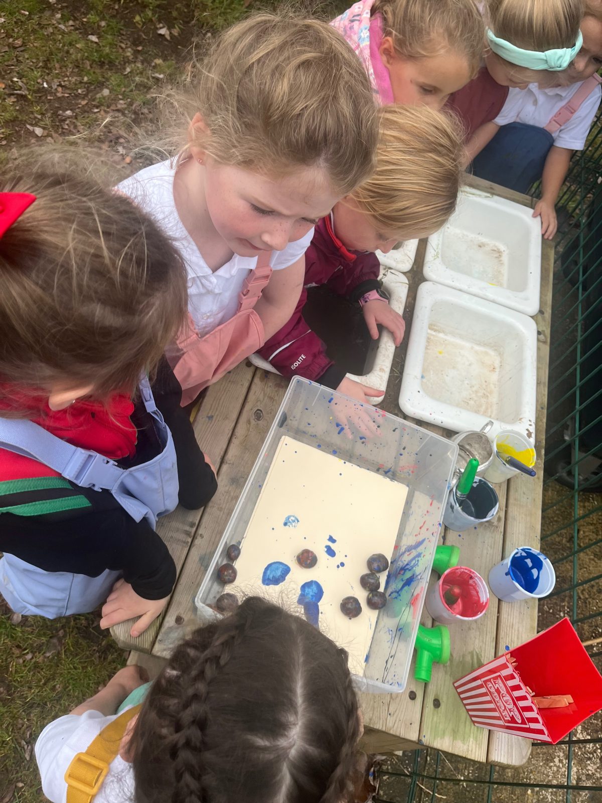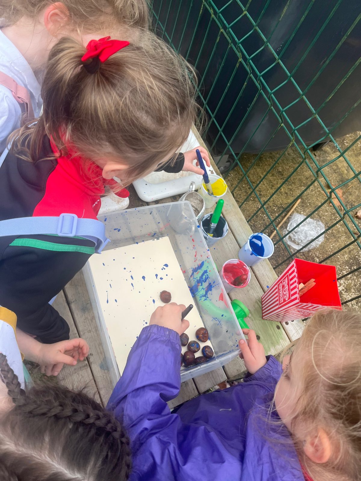 Conker roll! The children went on a Nature walk and gathered some conkers! They discussed where they came from, their shape, size and colour then had some fun creating colourful conker roll art! By simply adding some paint, they let the good times roll! 😂