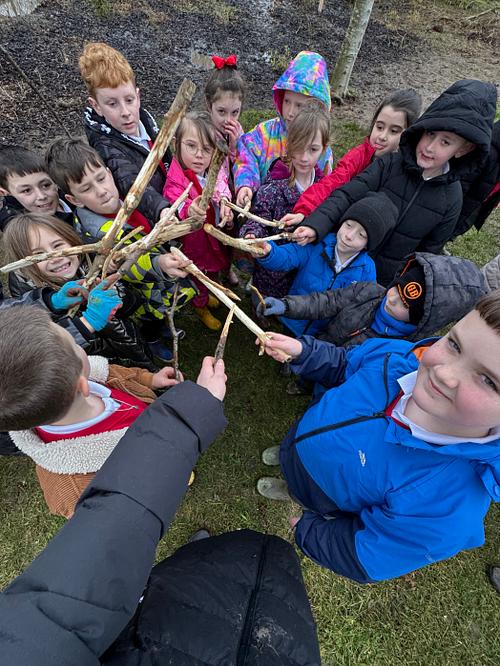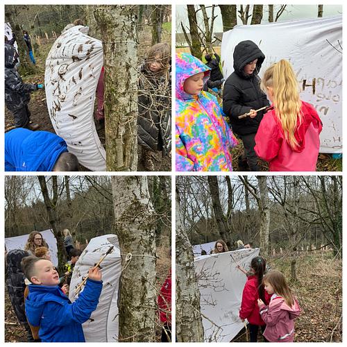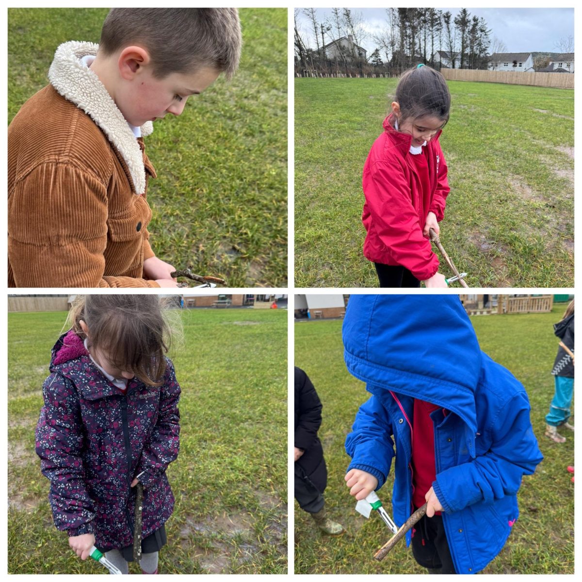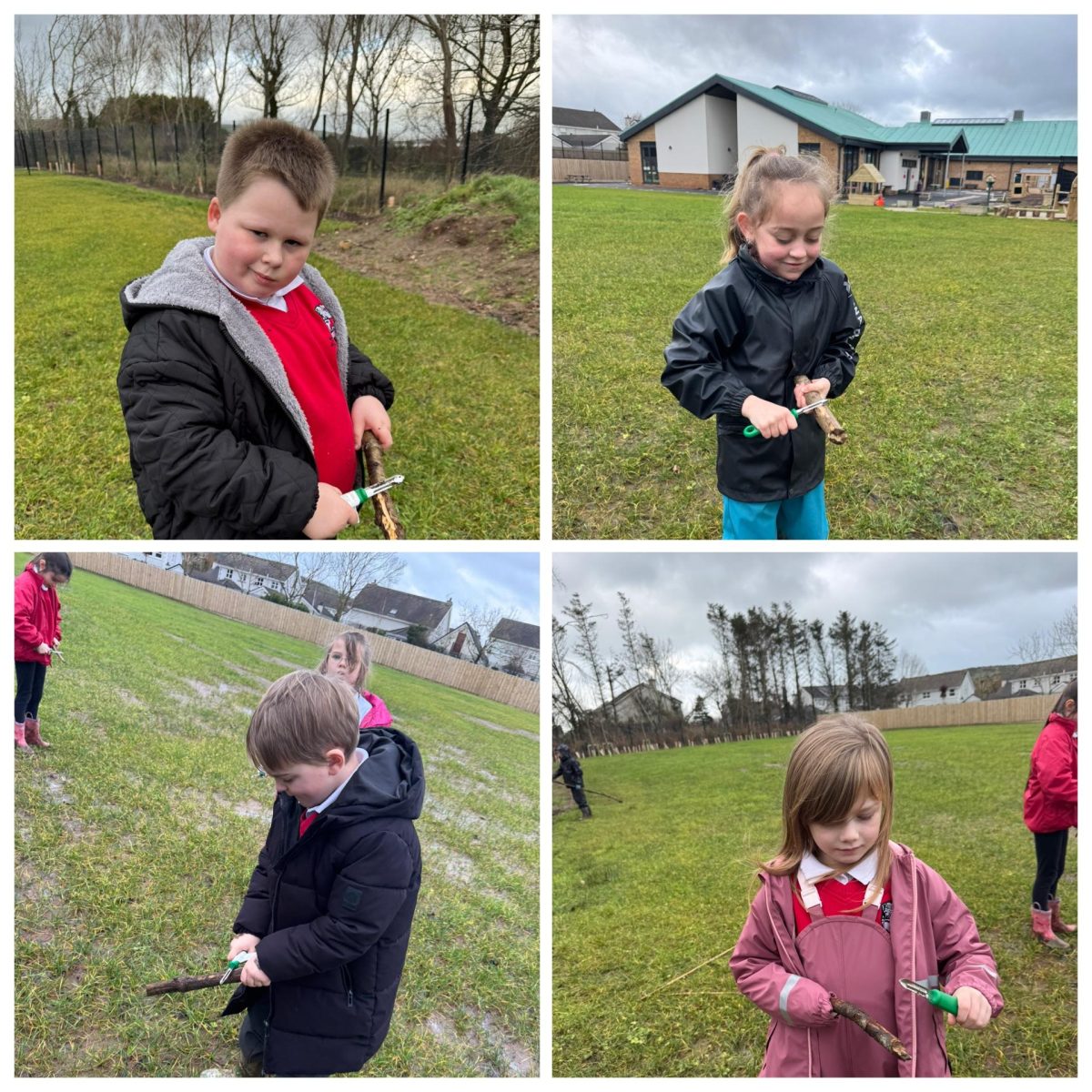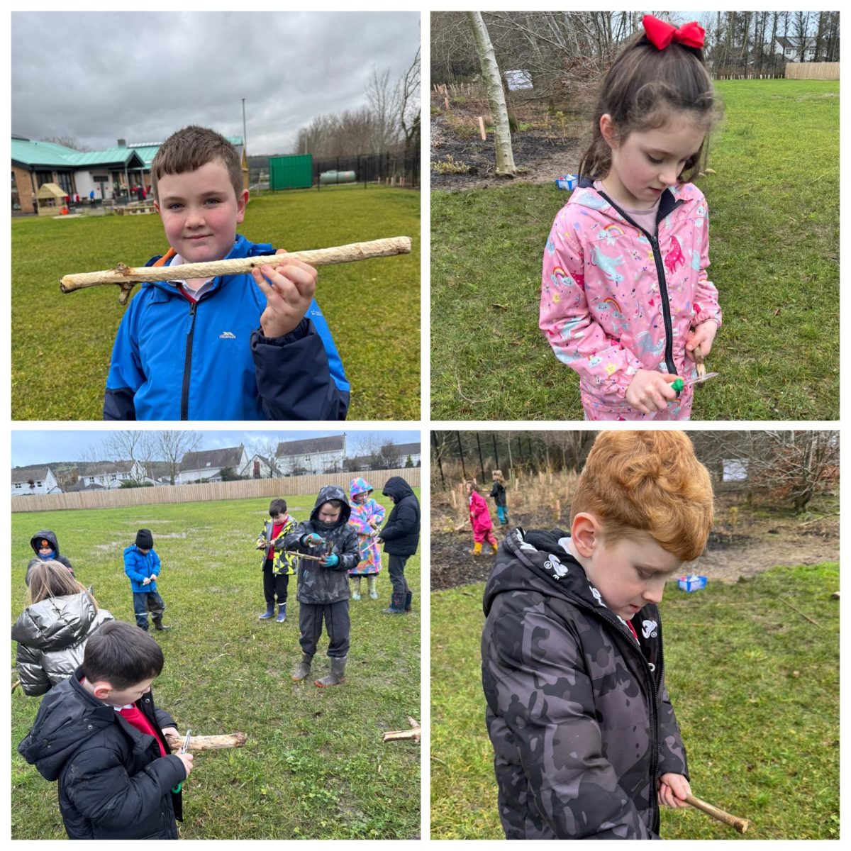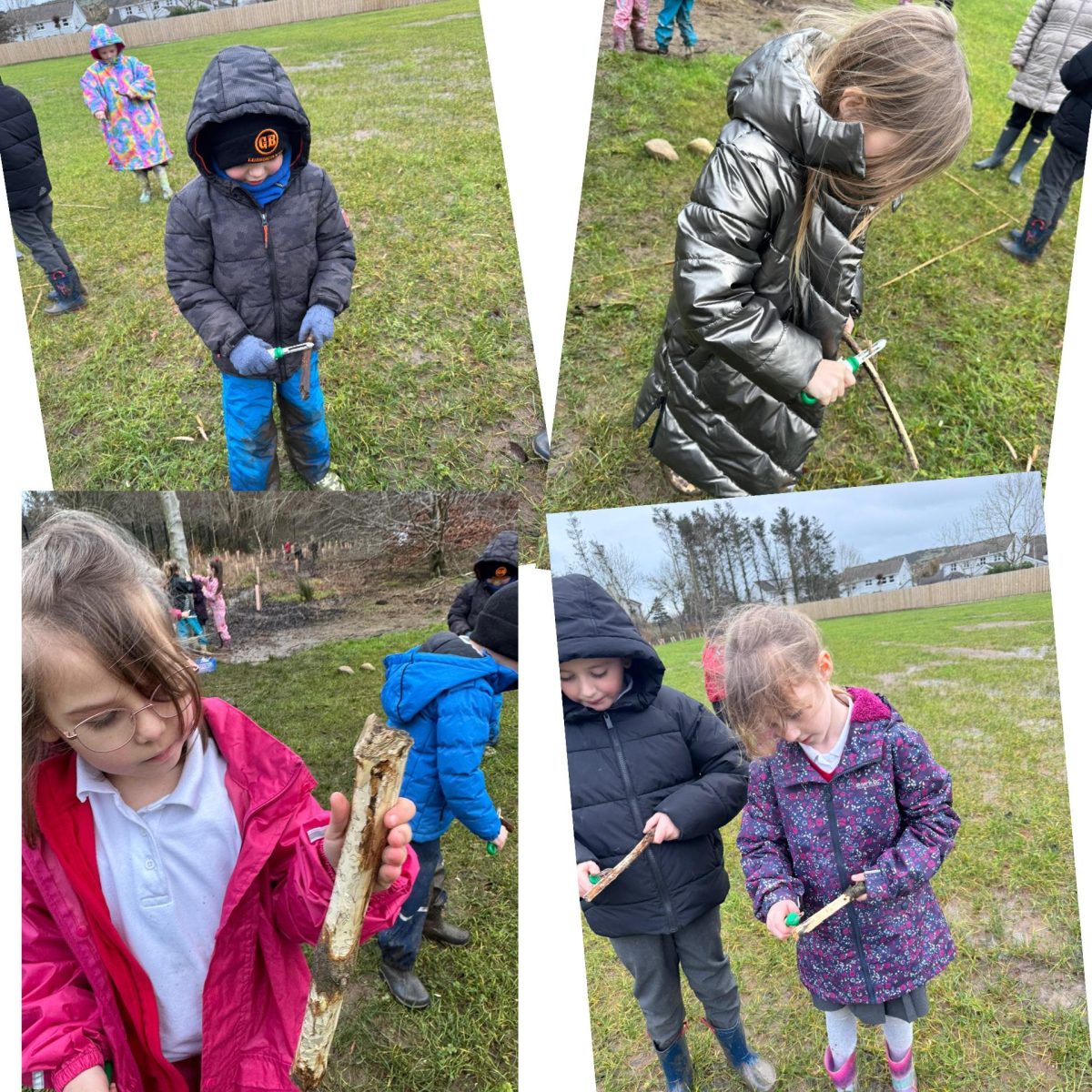 In today’s Forest School session, children developed practical outdoor skills and engaged in creative, reflective play. We introduced safe stick‑whittling techniques using potato peelers, supporting learners to handle tools responsibly and with increasing confidence. The children practised steady hand positioning, controlled movements, and awareness of their working space, which helped to build fine‑motor skills, patience, and focus.