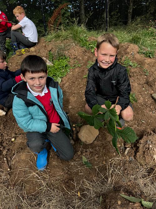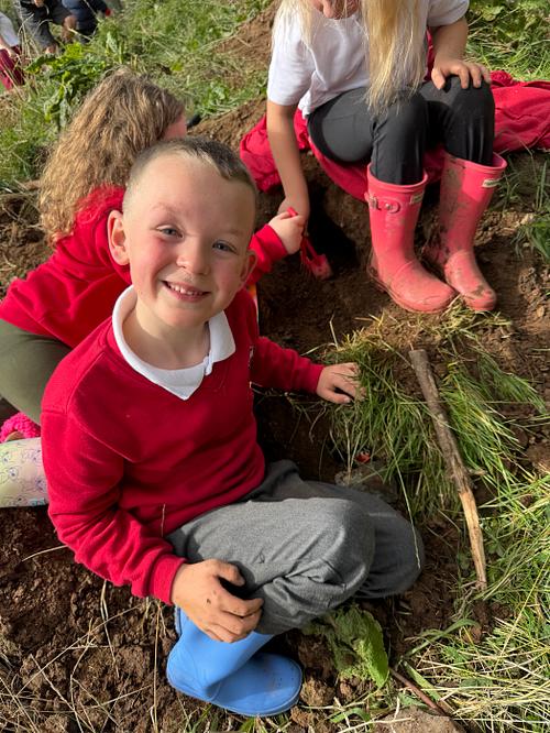 In today’s Forest School session, children revisited den building with a focus on developing their own design ideas and applying previous learning in new ways. Working in self‑selected groups, they explored the woodland to find a suitable site, taking into consideration ground conditions, natural features, and safety.