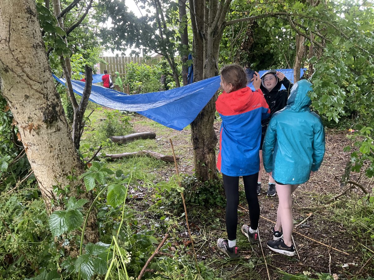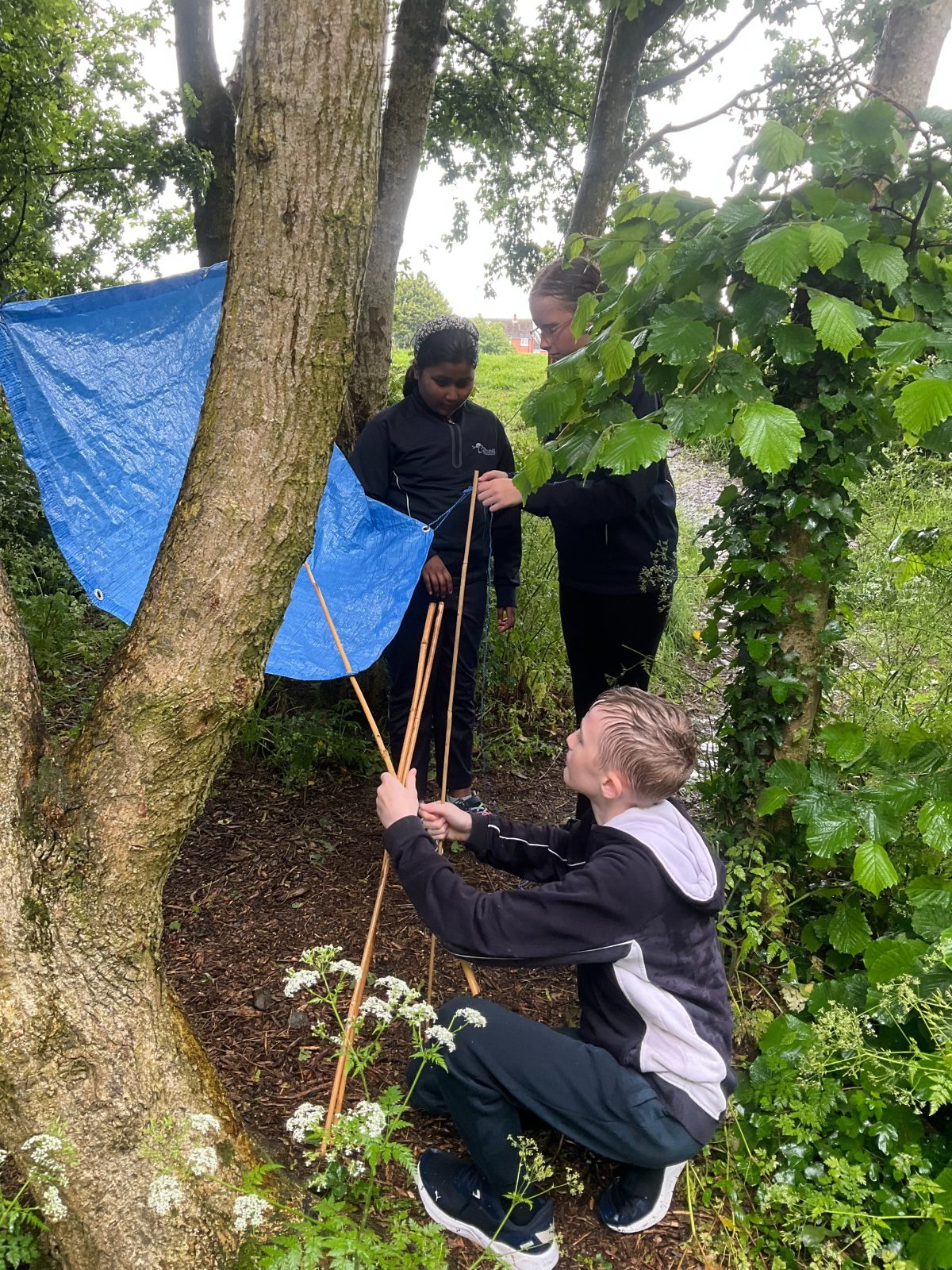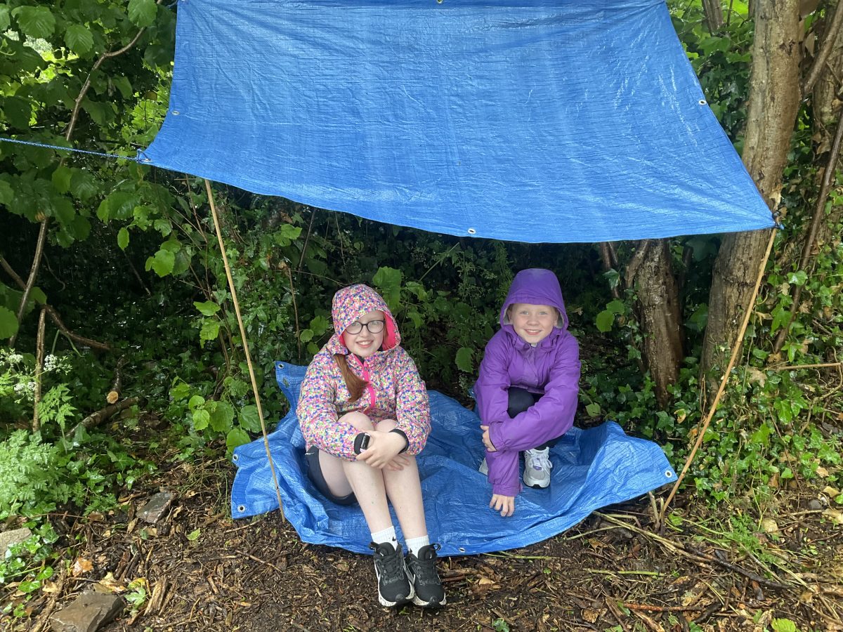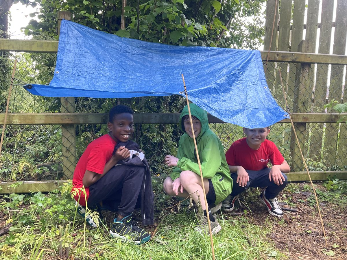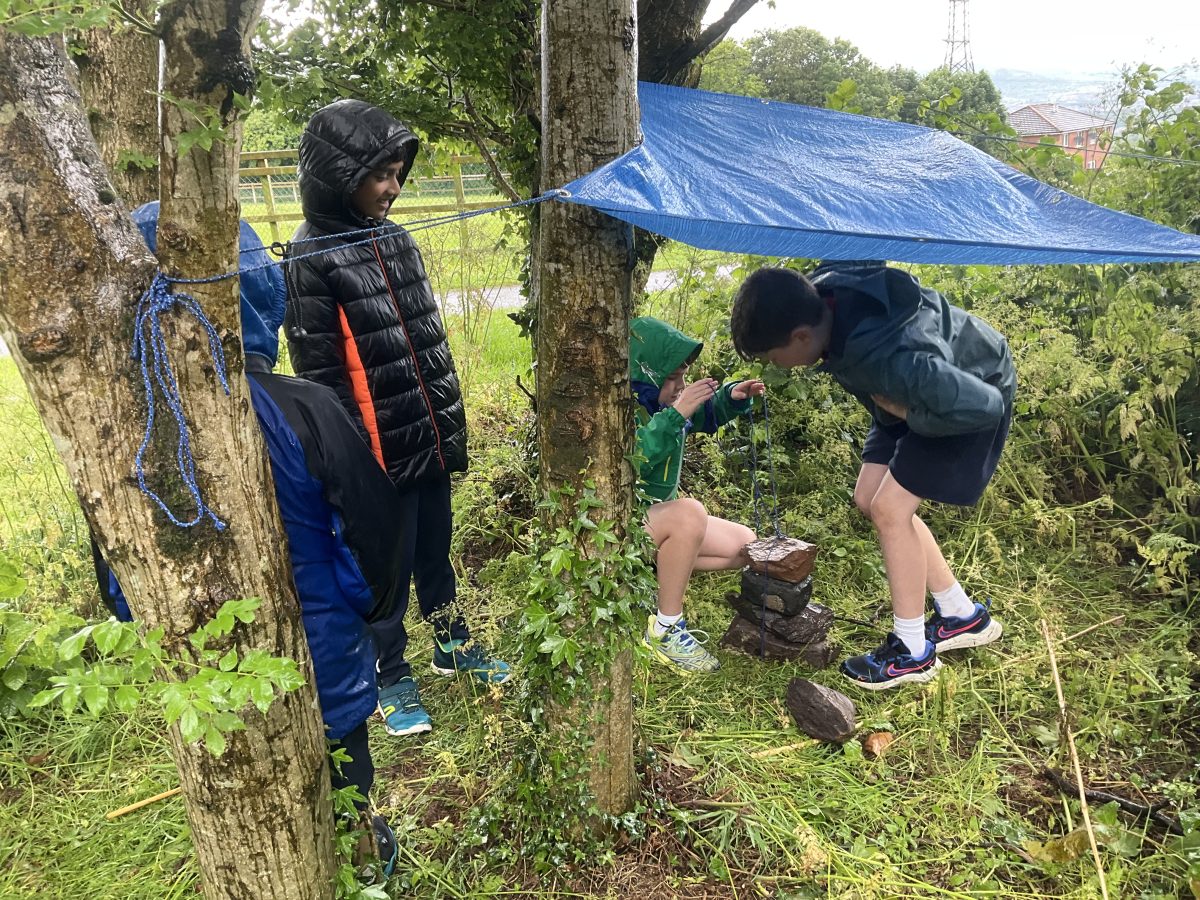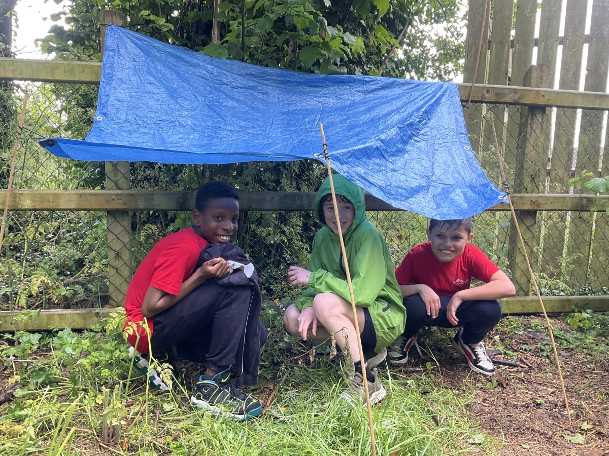 Our Primary 7 pupils have been learning practical outdoor skills in the small copse of trees near the school. Using bamboo canes, sticks, tarpaulins, bungee ties, and rope, they worked together to design and build sturdy shelters. This hands-on activity encouraged teamwork, problem-solving, and creativity while deepening their connection with nature.